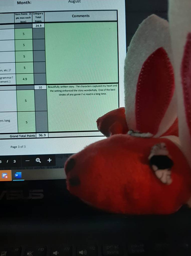 And I won. First place. To say I was excited is an understatement. Mi Espouso said I was going to be difficult to live with (I think he’ll survive). There were only two comments given in the feedback, including the statement “One of the best stroies[sic] of any genre I’ve read in a long time.”